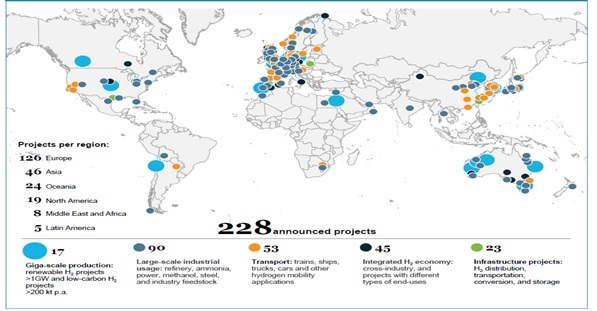 Açıklanan hidrojen yatırımları, hükümetin taahhütlerine cevap olarak hızla arttı. Derin karbondan arındırma için şu anda değer zincirinde 200’den fazla hidrojen projesi var, küresel projelerin %85’i Avrupa, Asya ve Avustralya’dan geliyor ve Amerika, Orta Doğu ve Kuzey Afrika’daki faaliyetler de hızlanıyor.