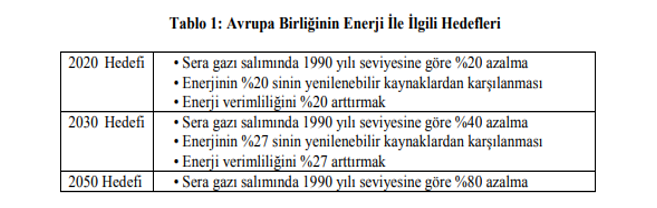 Bina sektöründe enerji verimliliği ve emisyonların azaltılması konusunda Avrupa Birliğinin 2020, 2030 ve 2050 yılı hedefleri aşağıdaki Tablo 1’de yer almaktadır.